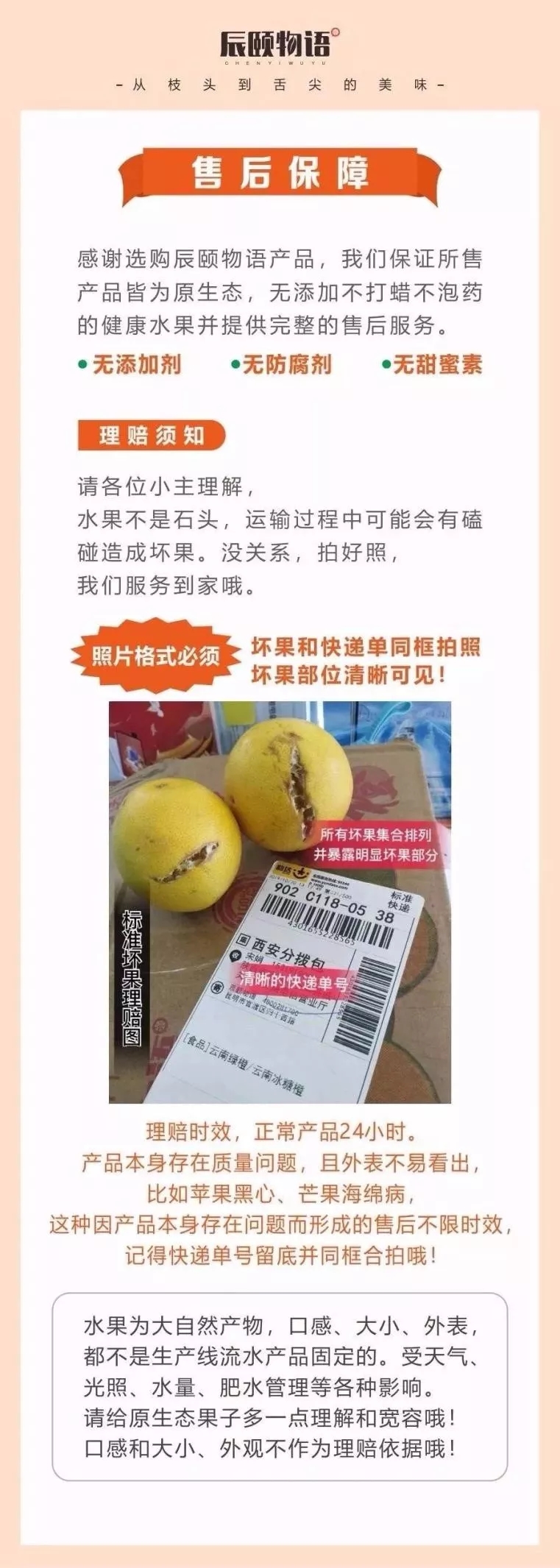 (3)如果丑橘出现干水现象,请把果肉剥开和单号一起拍照,不剥开不拍照的无法理赔。